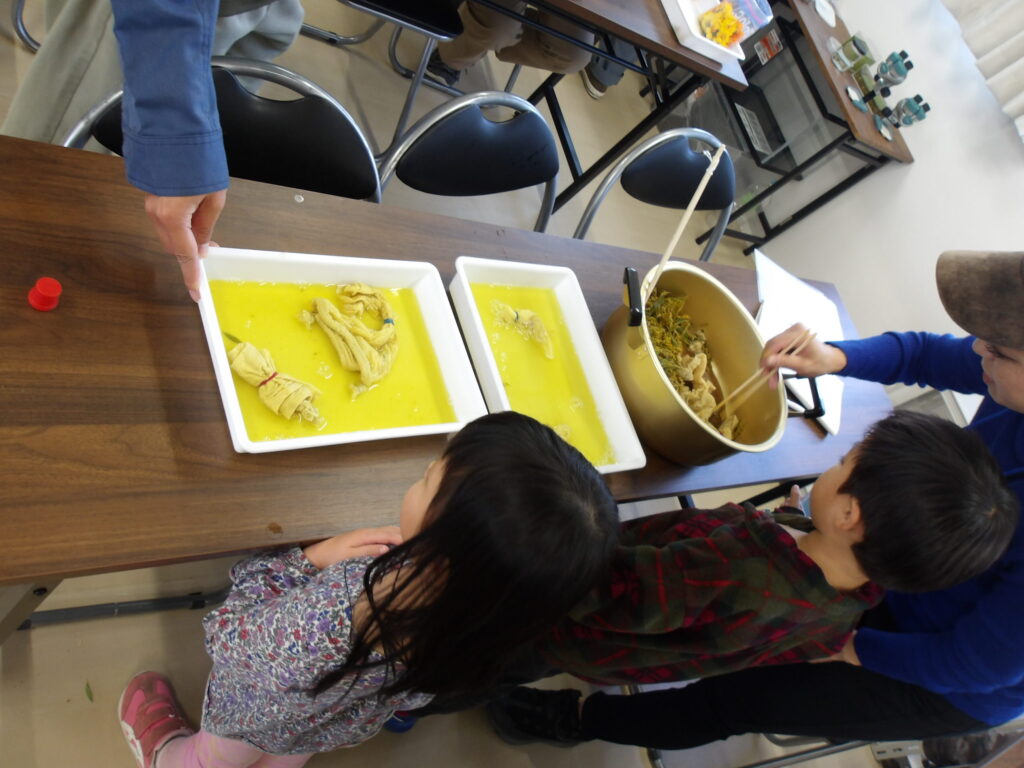 鍋の中と媒染液につけた後での色の違いに興味津々の様子でした。