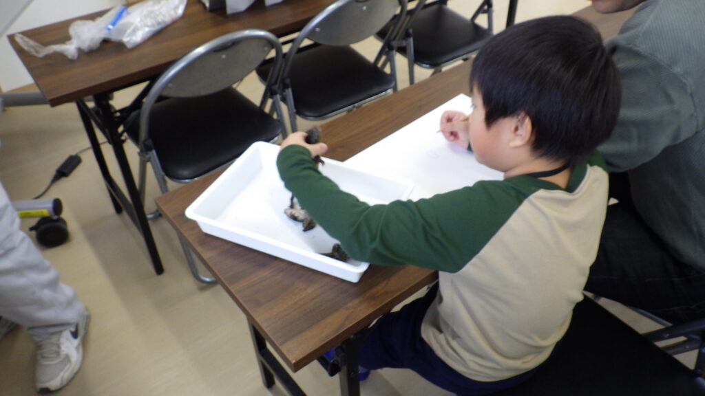 しぜん・いきもの調査員養成講座では、鳥の羽根の名前や役割、模様の違いなどを学び、外に出て羽根を探しにいきました。