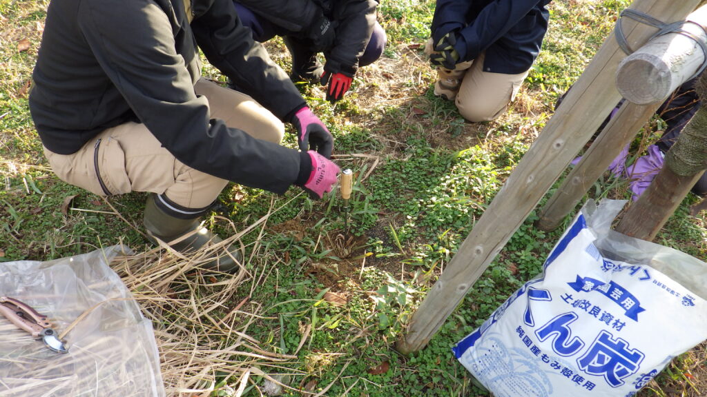 座学をしたのちはばたき公園内樹の付近に穴をあけ乾燥させた葉と燻炭、水を詰め、土壌改良を行いました。