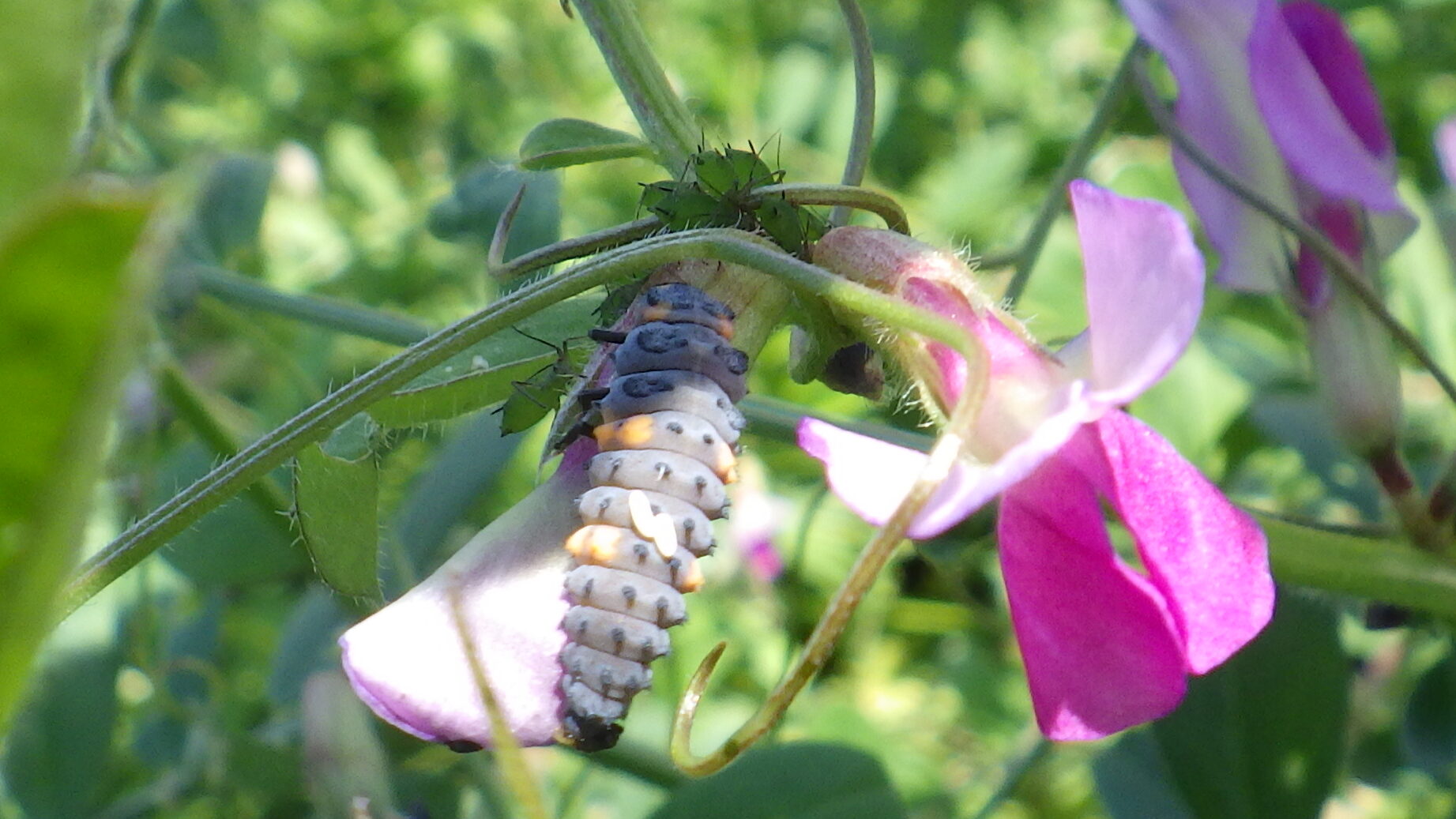 成虫に加え、カラスノエンドウについているアブラムシを捕食している食べ盛りの幼虫も観察できました。