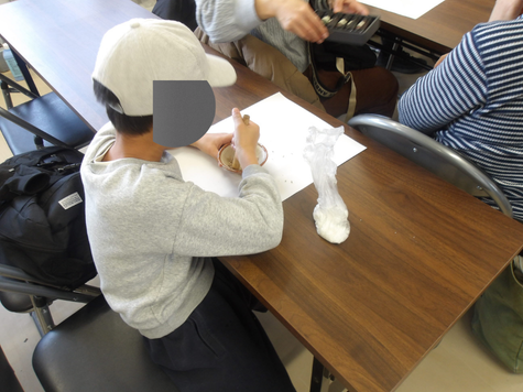 はじめは室内で鳥の羽根などを実際に見て触って学びます。